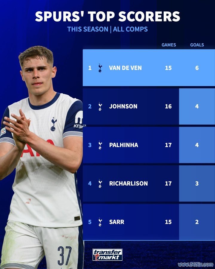 本赛季热刺队内射手榜:中卫范德芬6球居首,约翰逊、帕利尼亚4球