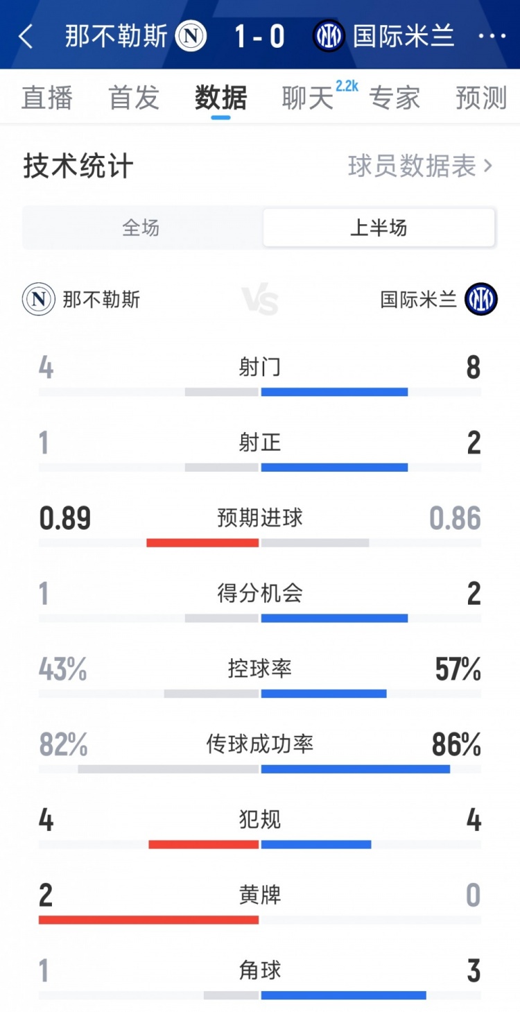 那不勒斯1-0国米半场数据:射球 4-8,射正1-2,积分 机会1-2