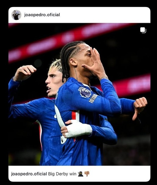 若昂-佩德罗在ins上晒出了自己庆祝得分 时的图片,并配文写道:“伟大的德比获胜 。”