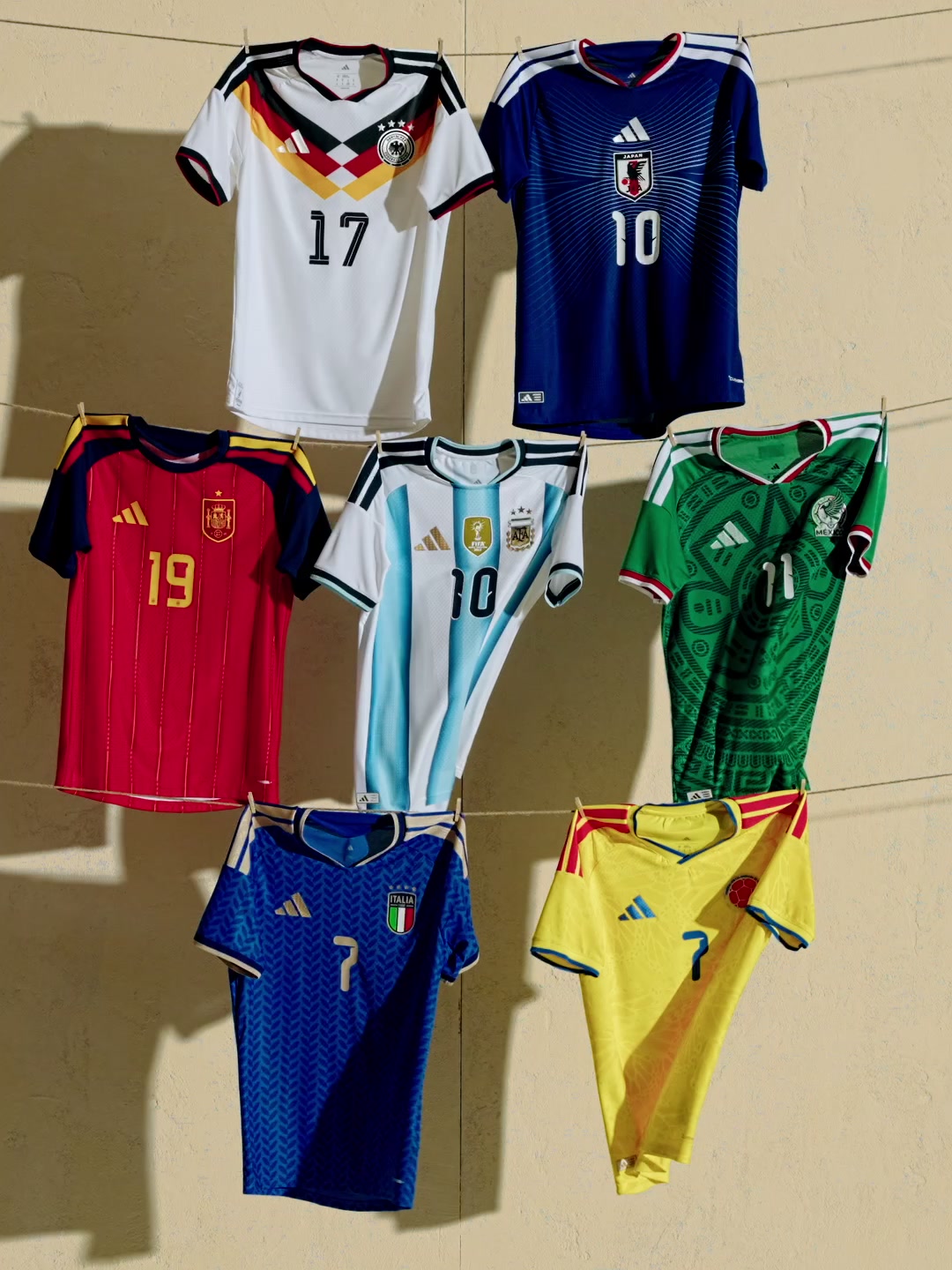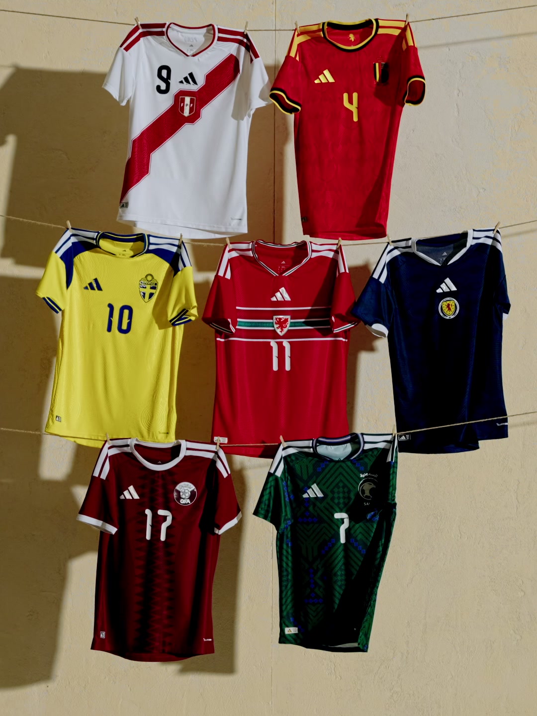 这22支球队分别是:阿尔及利亚、阿根廷、阿拉伯联合酋长国、北爱尔兰、比利时、秘鲁、德国、哥伦比亚、哥斯达黎加、卡塔尔、墨西哥、日本、瑞典、沙特阿拉伯、苏格兰、威尔士、委内瑞拉、乌克兰、西班牙、匈牙利、意大利、智利。[ 牙买加队主场作战 运动活动 服 将于2026年单独发布。]
