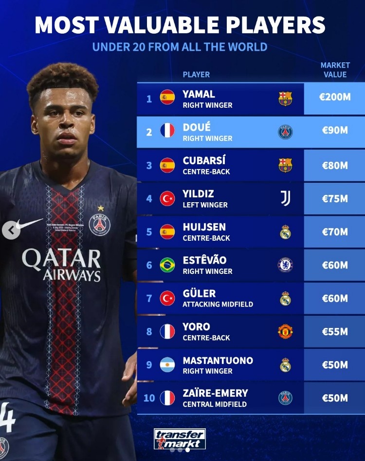 足坛U20球员身价榜:亚马尔2亿欧居首,杜埃次席,库巴西第三